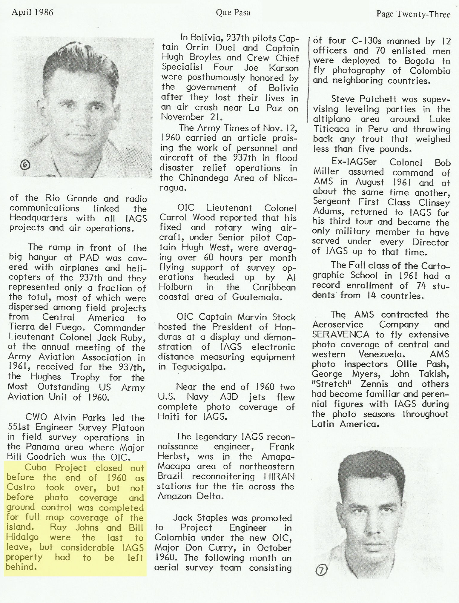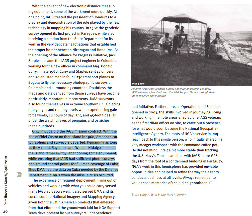 Remaining as long as they could to finish their work, Ray and William were soon forced to leave the island rather swiftly, leaving considerable IAGS property behind. The IAGS newsletter, Que Pasa, documented that by the time they fled, IAGS had completed imagery coverage and established a control network for Cuba. Former NGA Historian Dr. Gary E. Weir noted that although Ray and William were forced to abandon equipment in their urgency to flee the country, they did manage to ensure that IAGS had sufficient photo surveys and ground control points for full map coverage of Cuba. Thus the Defense Mapping Agency (DMA) had the data on Cuba that would be needed by the Defense Department in 1962 to quickly and efficiently respond to the Cuban Missile Crisis.