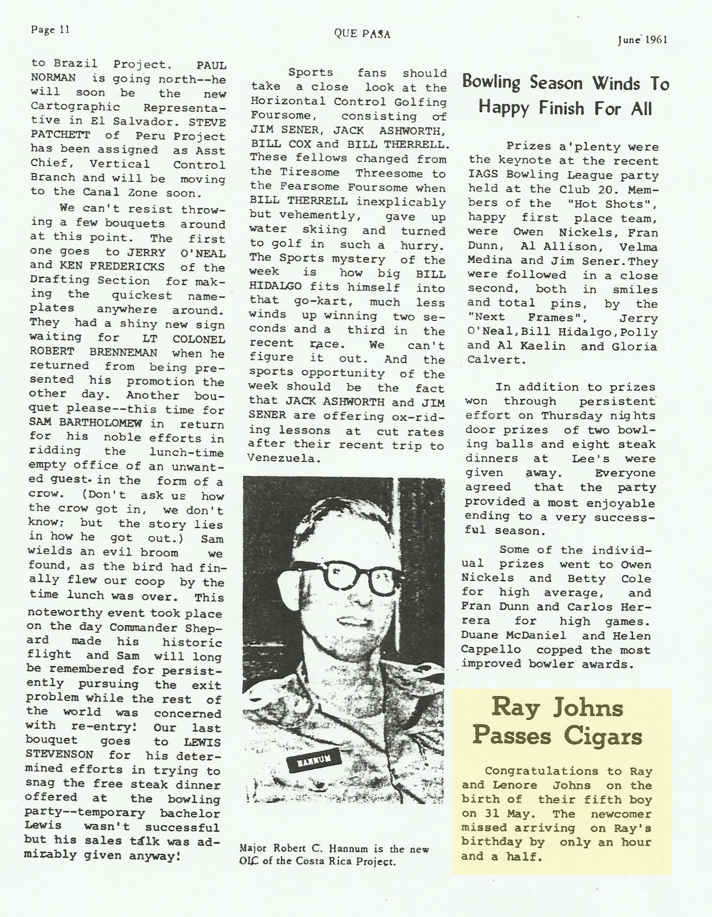 His youngest son Kevin was born in Panama on 05/31/1961 during a 1-year stay in between assignments in Cuba (1957-1960) and Brazil (1961-1971). The June 1961 issue of the IAGS newsletter, Que Pasa, notes that Ray passed out cigars at work. Kevin missed being born on Ray’s birthday by only an hour and a half, even closer to sharing a birthday with Ray than my mother was!