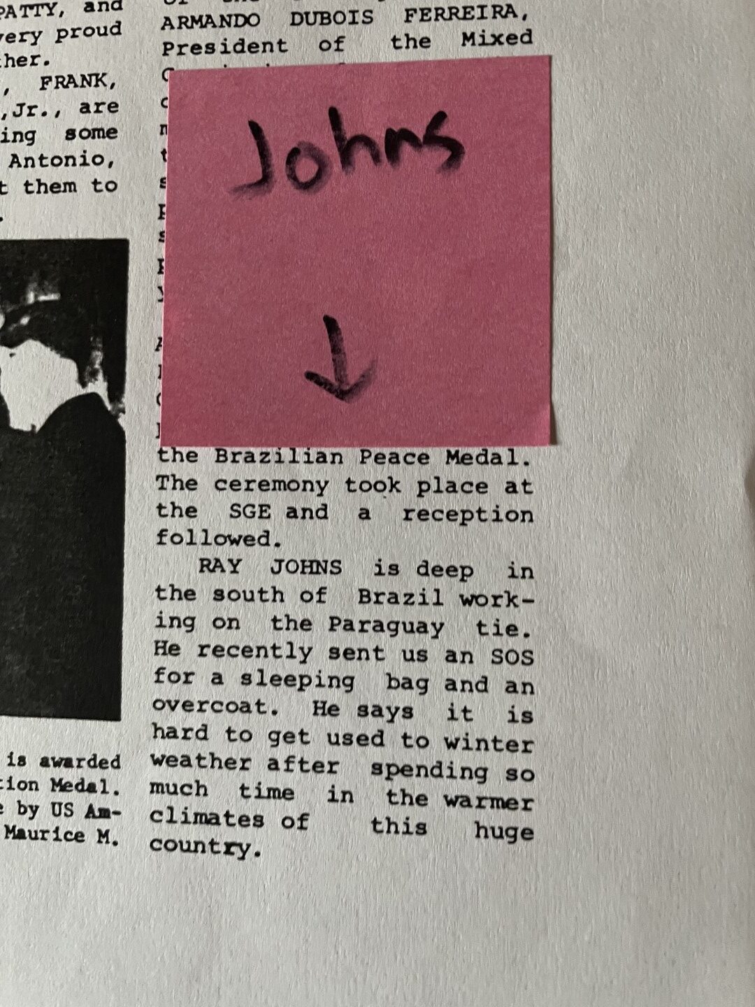 In June of 1963, Que Pasa reported that Johns was working in the far south of Brazil to tie the Brazil control network to the control network in Paraquay. He forwarded an “SOS for a sleeping bag and an overcoat”, saying that it was hard to get used to winter weather after spending so much time in the warmer climates of Brazil.