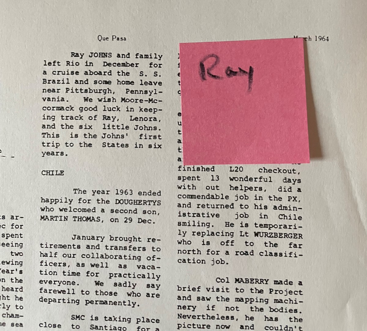 Another Que Pasa Newsletter (June 1964) mentions that in December 1963, after completing an assignment, Ray, his wife Lenora and six “little Johns” cruised aboard the S. S. Brazil and enjoyed some time at home for the first time in six years.