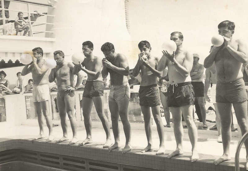 There were a lot of photos from their cruise aboard the S.S. Brasil. My mother laughed as she saw the photo of Ray blowing up a balloon by the side of the pool for some contest or game. She pointed out that while all the other men wore swim trunks, Raymond was wearing skimpy men’s bottoms, and said “He’d probably have been naked if they let him!” Apparently Ray was very free with his body for someone of his generation!